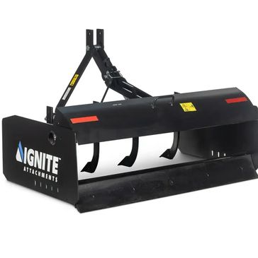 This rear-mount box blade cuts, moves and levels dirt, gravel and many other materials. Its heavy duty, built to last, and designed and made in the USA.